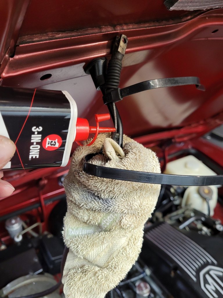 I disconnected the cable from the engine end and strapped it up on the bonnet prop and dripped 3in1 oil onto the top of the inner cable for it to flow down into the outer cable. I did this till I saw it drip through inside the car onto a rag placed to catch the oil from going on the carpet.