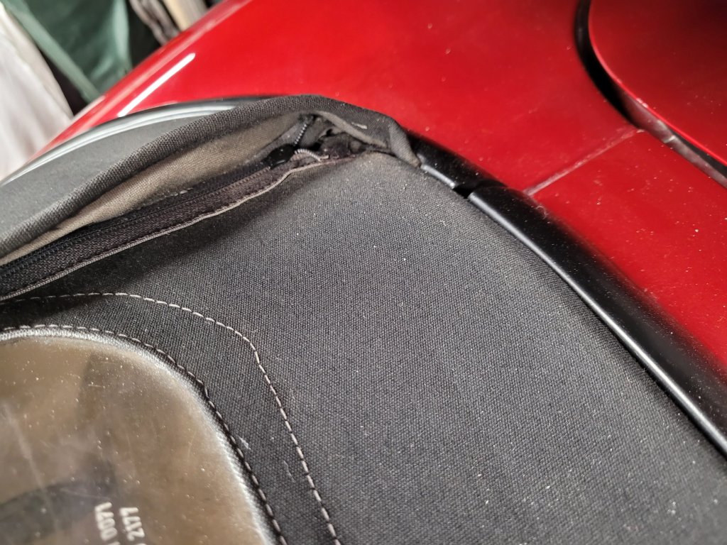 I had not taken the roof down since I have had the car so first to release the 2 clips over the front windscreen to release tension across the hood and unzip the rear window. But as soon as I started to move the zip I saw a problem that a lot of the zip was not holding together – and the slider was extremely stiff to move and became jammed solid! I used some pliers to get a better grip on the slider but alas! …. the slider broke in 2!!