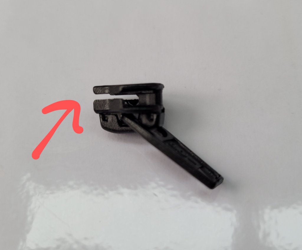 The new slider worked but on the first attempt parts of the closed zip came apart – it just needed a little more closing ability. So I removed the new slider and carefully closed up the trailing end with some pliers to make a slightly smaller gap (see photo/arrow). That when refitted then worked perfectly ….. and a relief that I’m not going to have to take it to a specialist to sort out.