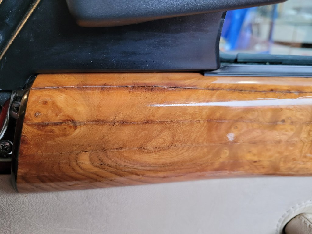 Although the woodwork on the dash is pretty well perfect condition the door caps have not faired so well. There are several long cracks along the cappings and along the crank the varnish is coming away from the wood leaving whitish streaks.
