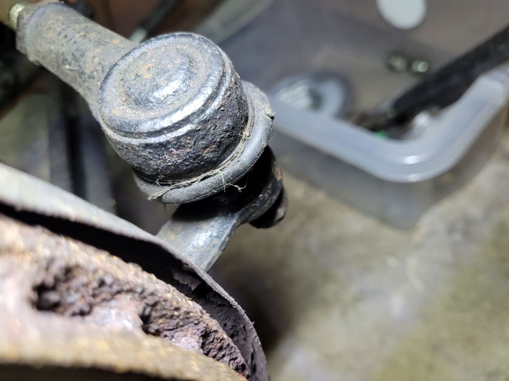 Got the car jacked up under the front cross member and axle stands under the front chassis frame. Wheels off and slackened the tracking adjustment nut. The track rod ends came away surprisingly easily – usually have to prise them off. They seemed a bit sloppy so I am replacing them.