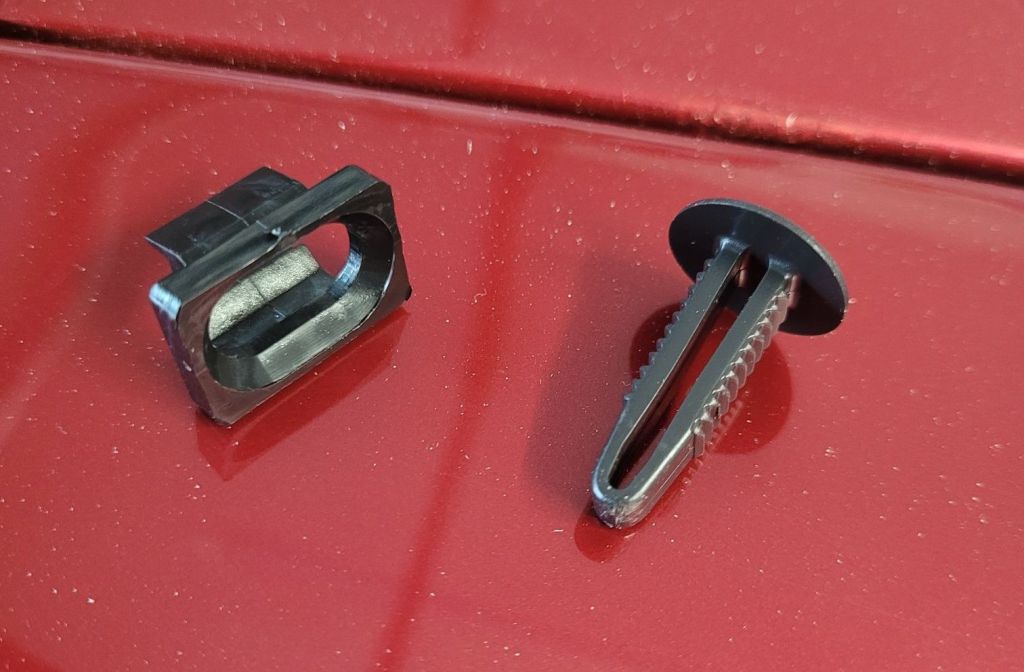 I found the parts on Brown and Gammons and added them to my next order. Easy job to fit. They are designed that you push the stud in place so that the serrated edge on the stud grips to a corresponding edge on the clip. To undo you turn the stud 90deg and it flicks out.