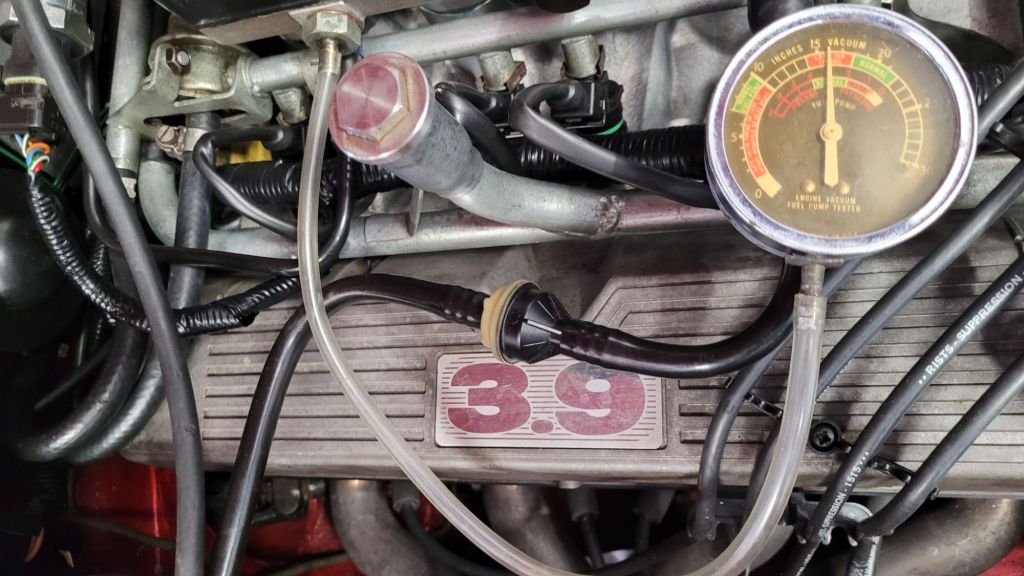 I did a vacuum check on the engine with my trusty old vacuum gauge. I used the manifold take-off for the fuel emissions cannister to connect the gauge.