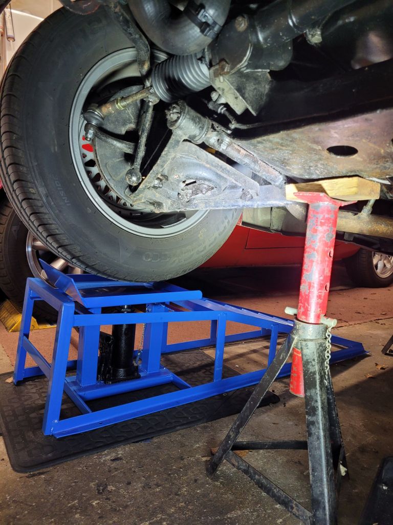 Whilst having the car on ramps when replacing a leaking sump gasket I thought it a good opportunity to see that if i propped up the front on an axle stand then lower the ramp whether the wheel would remain suspended. It all depends on whether the hydraulic part of the ramp would lower enough to suspend the wheel …… which it did.